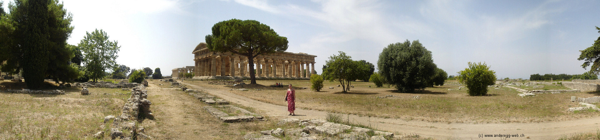Tempelanlage in Paestum in einer Panoramaaufnahme.