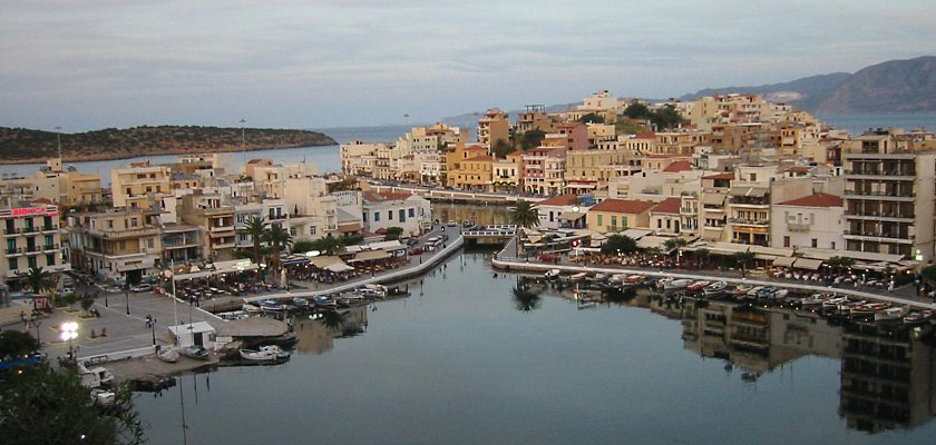 Bauten in der weiten Landschaft Kretas: Die Kirche in Kritsa (links) und eine alte Windmühle (rechts). Der Hafen von Agios Nikolaos am Abend. Ein typisches Landschaftsbild von Kreta im Frühling. Es gibt viele Olivenbäume.